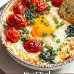 Baked Feta Eggs Breakfast is a delicious and easy-to-make dish combining creamy baked feta cheese with juicy cherry tomatoes, aromatic garlic and onion, and perfectly baked eggs. This flavorful Mediterranean-inspired breakfast is finished with fresh basil and enjoyed best with crusty bread for dipping.