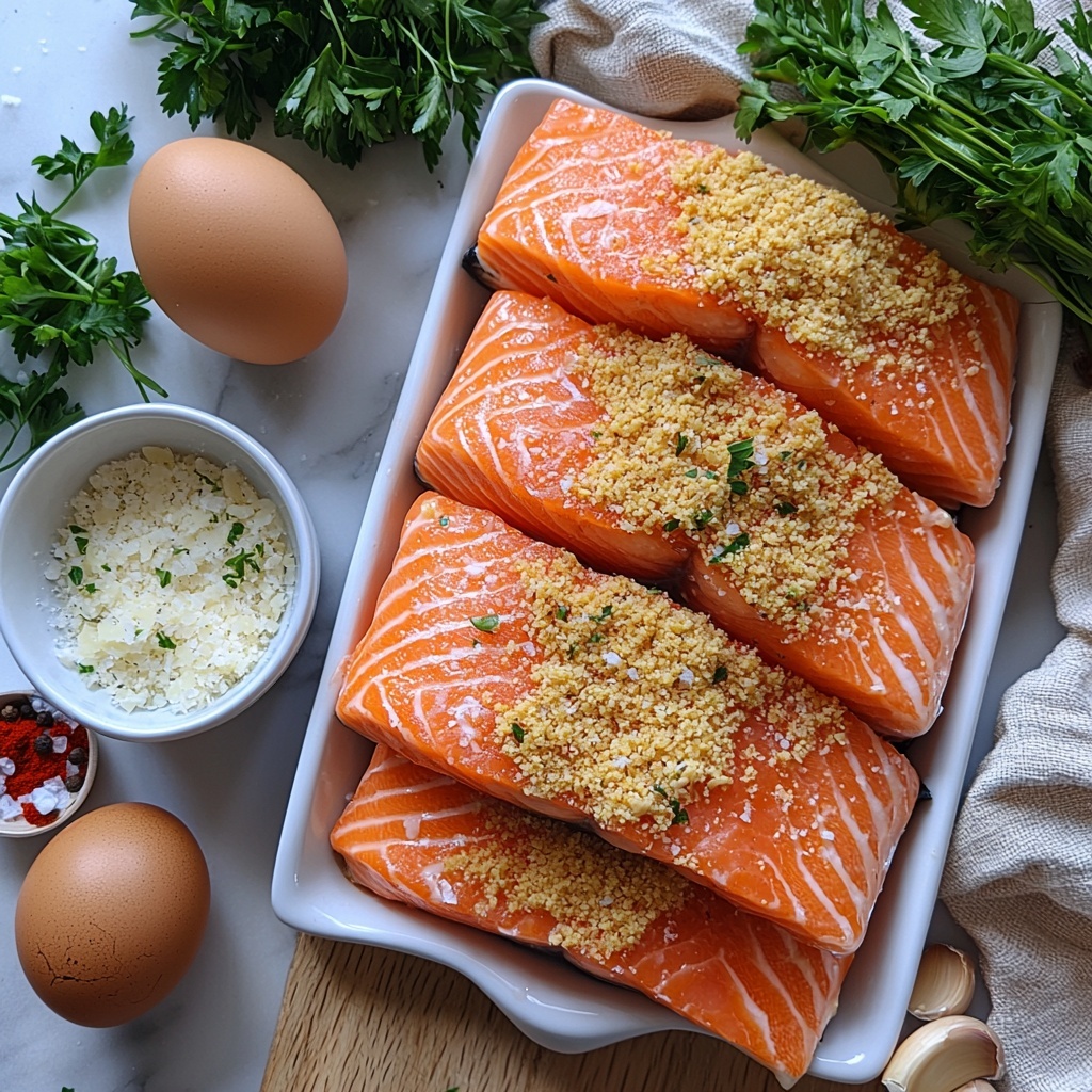 2. Mix Ingredients: In a large mixing bowl, combine the skinless, boneless salmon with breadcrumbs, grated Parmesan, chopped parsley, minced garlic, egg, Dijon mustard, salt, black pepper, and paprika. Mix thoroughly until all ingredients are well incorporated.