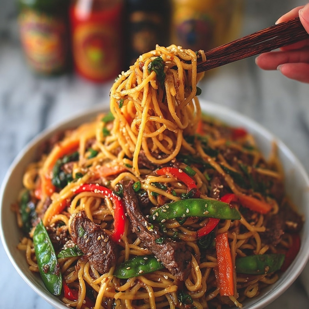 This classic Beef Lo Mein recipe features tender marinated flank steak stir-fried with fresh vegetables and lo mein noodles in a savory, flavorful sauce made from a blend of soy sauces, oyster sauce, and aromatic seasonings. Perfect for a quick, satisfying, and authentic Chinese-inspired meal that serves six.