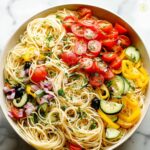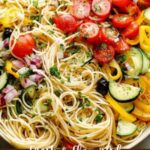 This California Spaghetti Salad Recipe isn’t ideal for freezing because the fresh vegetables and dressing don’t hold up well to freezing and thawing. For best results, enjoy it fresh within the recommended storage timeframe.
