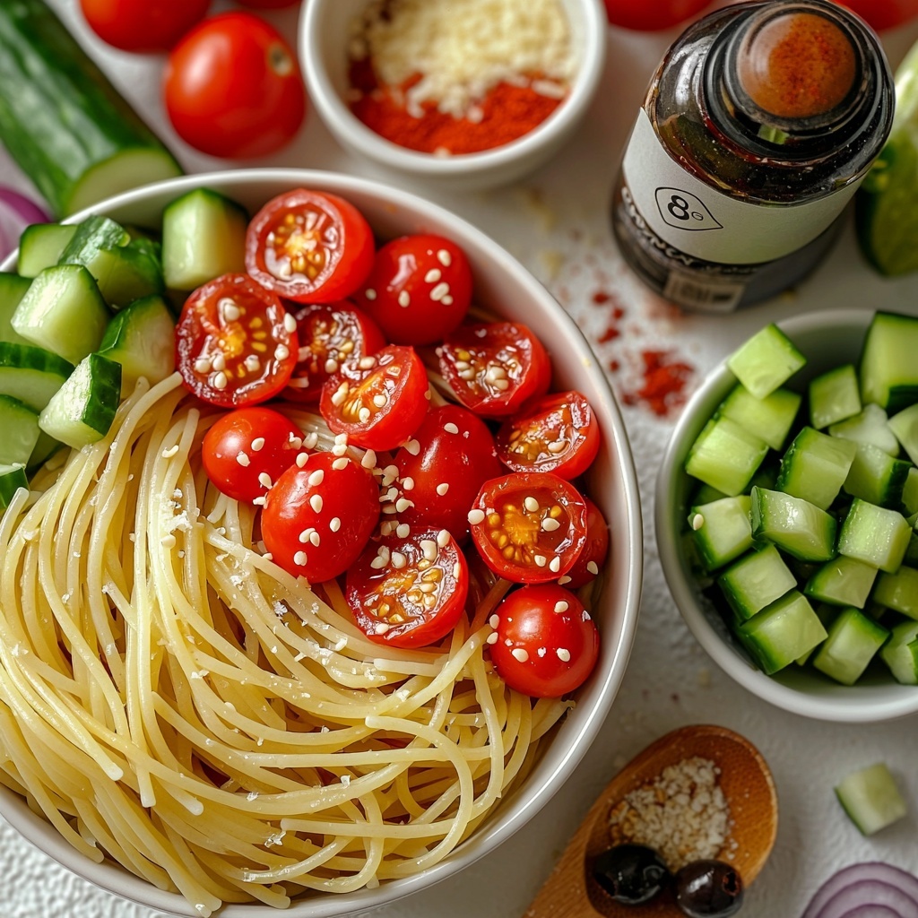 Start by boiling your spaghetti according to the package instructions until it’s perfectly al dente. Once cooked, drain the pasta and rinse it under cold water to cool it down quickly and stop the cooking process. This step is key to keeping the noodles tender but firm and ready to absorb the delicious dressing without getting mushy.