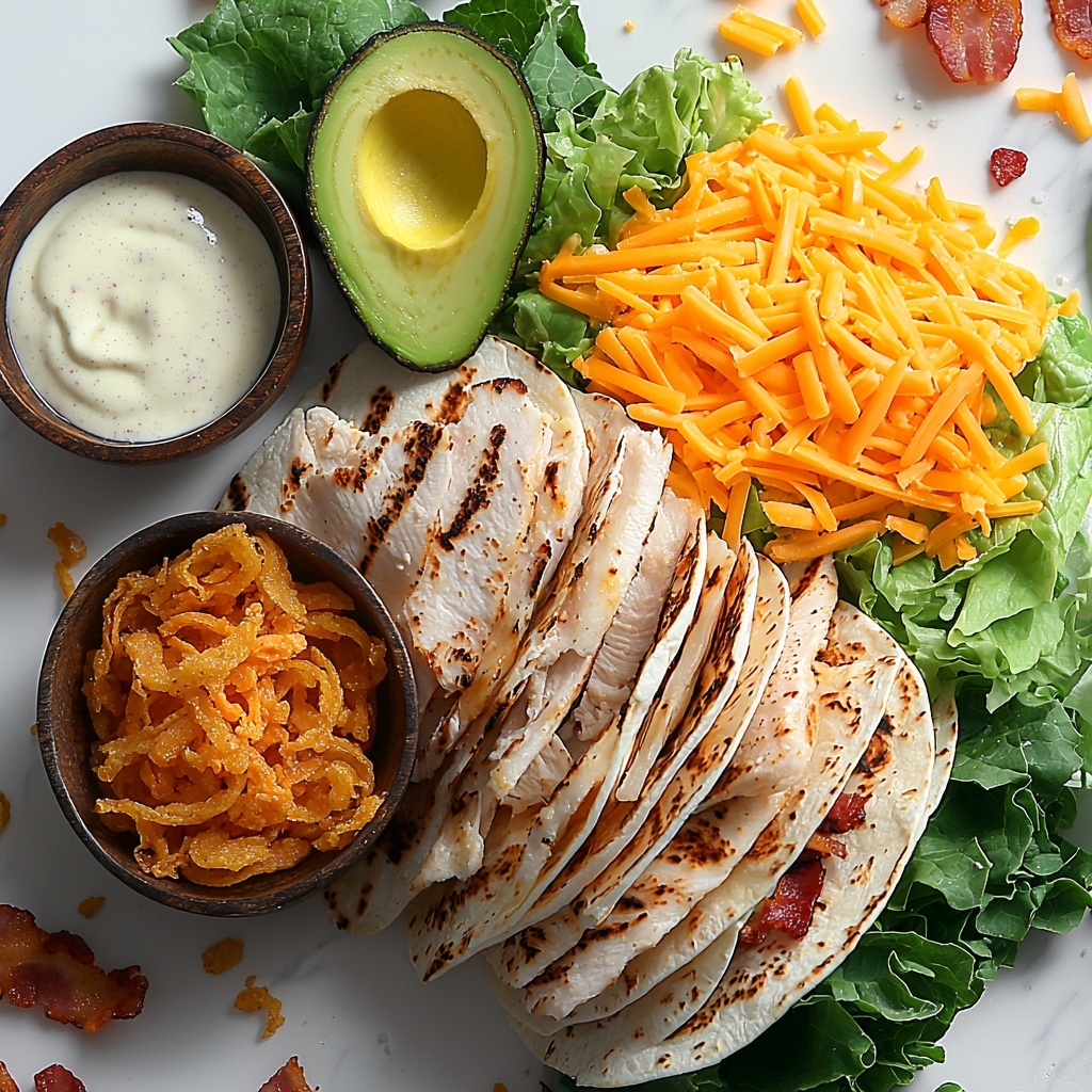 These ingredients are refreshingly simple yet perfectly balanced to deliver the full, mouthwatering experience of this Cheddar Bacon Ranch Chicken Wraps Recipe. Each component brings something special to the plate — from the crispy bacon adding that irresistible smoky crunch to the creamy avocado offering a cool contrast that completes the wrap.