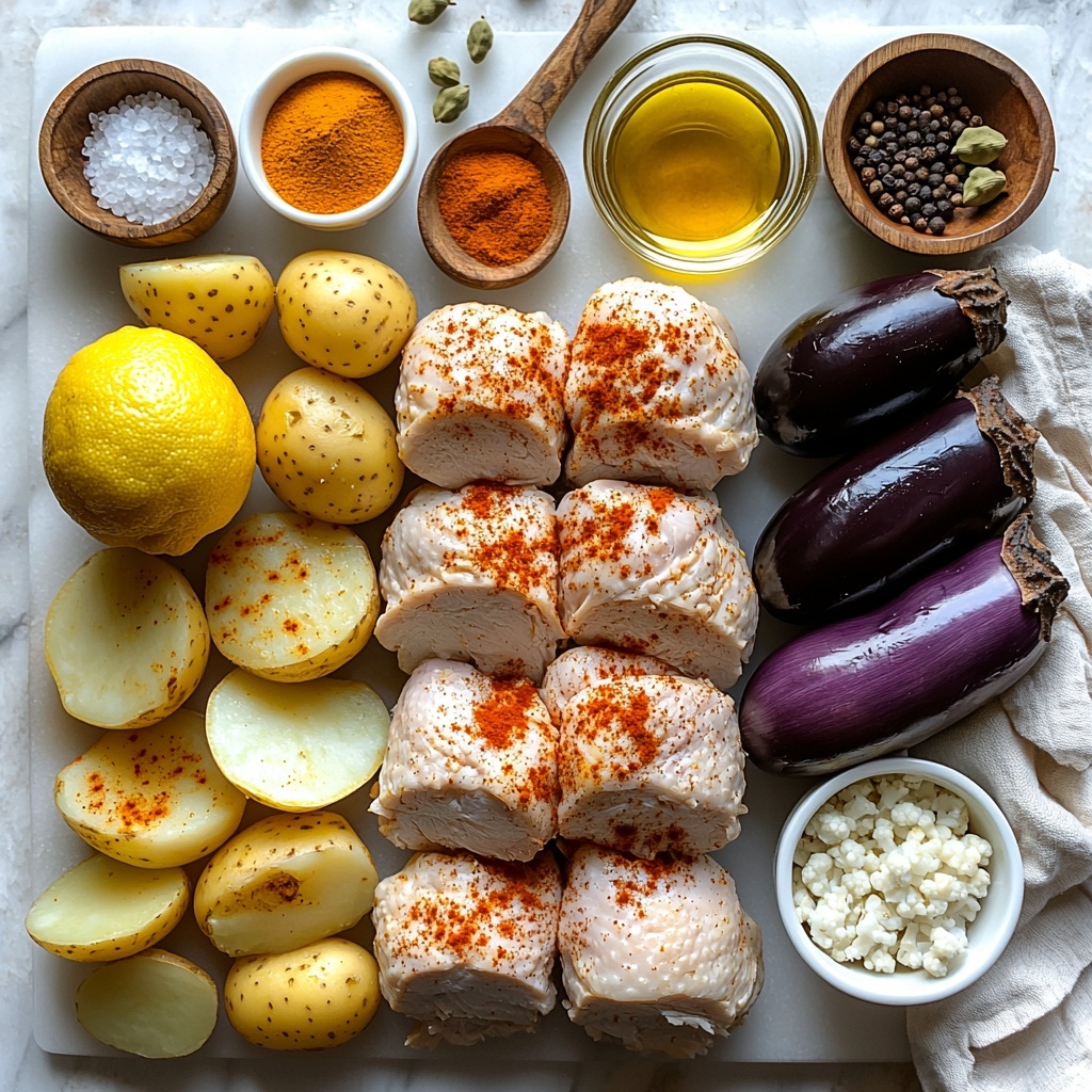 - Assemble Maqluba Layers: In a deep, oven-safe pot, layer the roasted chicken at the bottom, followed by layers of roasted potatoes, eggplant, and cauliflower.