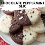 These Chocolate Peppermint Slice and Bake Cookies are a festive and delicious treat featuring rich cocoa dough studded with chocolate chips, sliced and baked to perfection, then dipped in melted white chocolate and sprinkled with crushed candy canes for a refreshing peppermint twist.