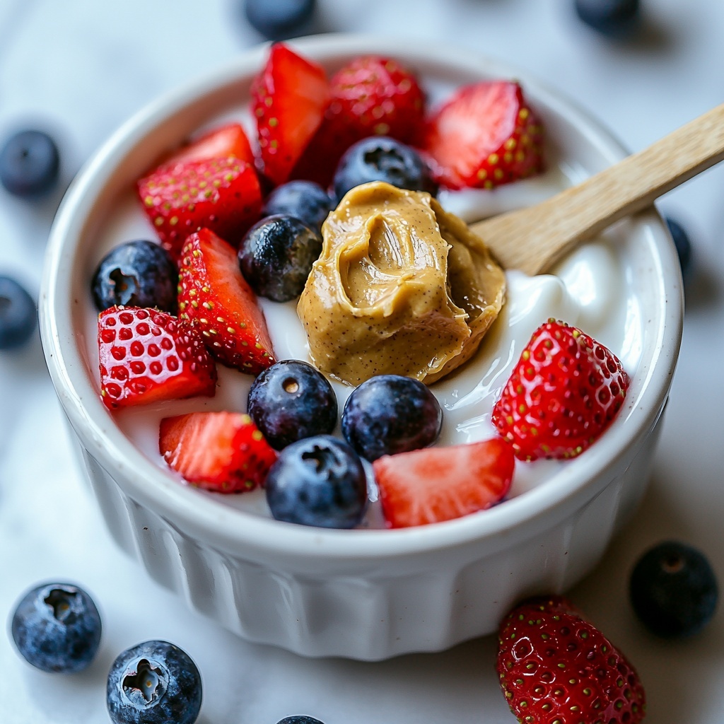 2. Mix Ingredients: In a mixing bowl, combine the plain yogurt with the finely diced strawberries, blueberries, and peanut butter. Stir well until all ingredients are evenly distributed throughout the yogurt.