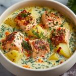 Cozy Salmon Chowder is a comforting and creamy soup featuring tender chunks of fresh salmon simmered with hearty potatoes, carrots, celery, and aromatic herbs. This chowder balances rich creaminess with fresh dill and a hint of lemon, making it a perfect warm meal for chilly days.