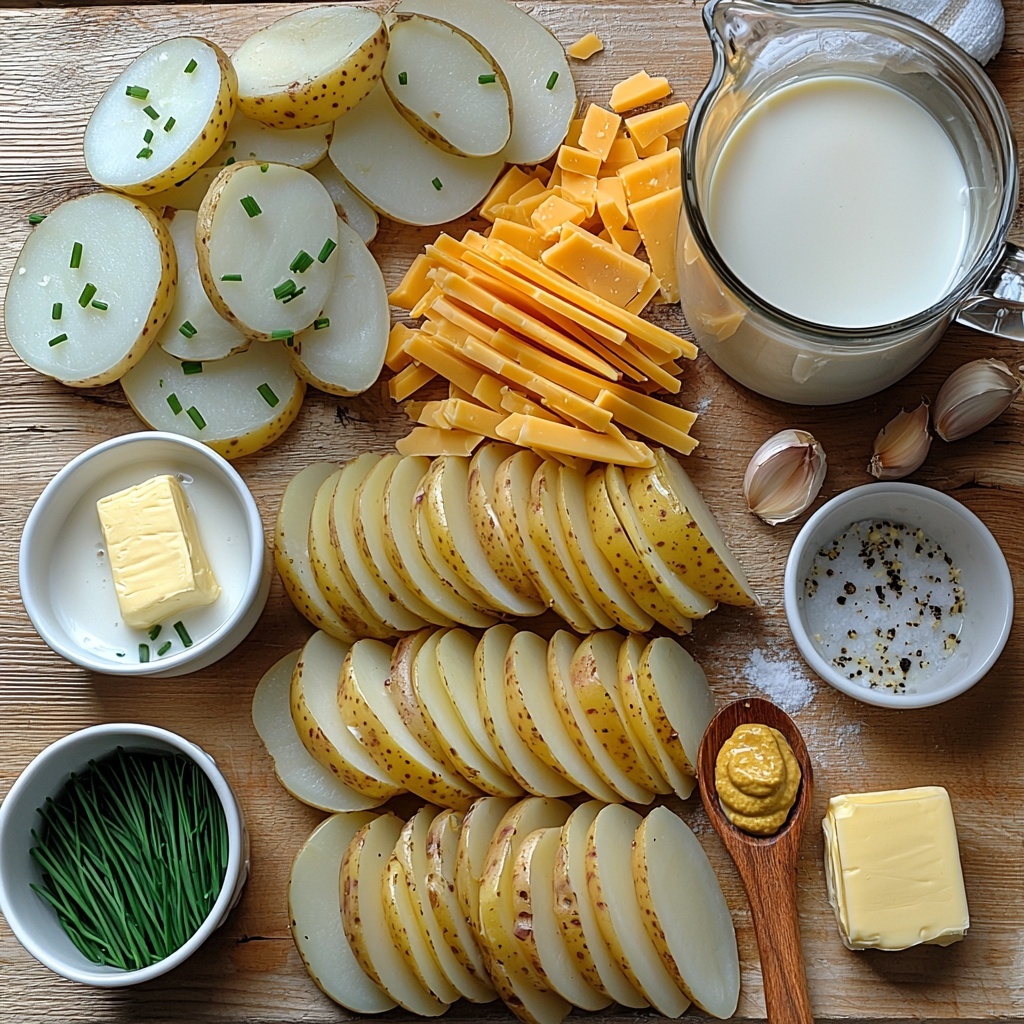 Gathering your ingredients is the first step to creating this melt-in-the-mouth Creamy Cheese and Potato Pie Recipe. Each element plays a crucial role in building the layers of flavor and texture that make this dish so irresistible. From the starchy potatoes that provide hearty substance to the blend of cheeses that adds richness and depth, these essentials come together to transform humble components into a star meal.