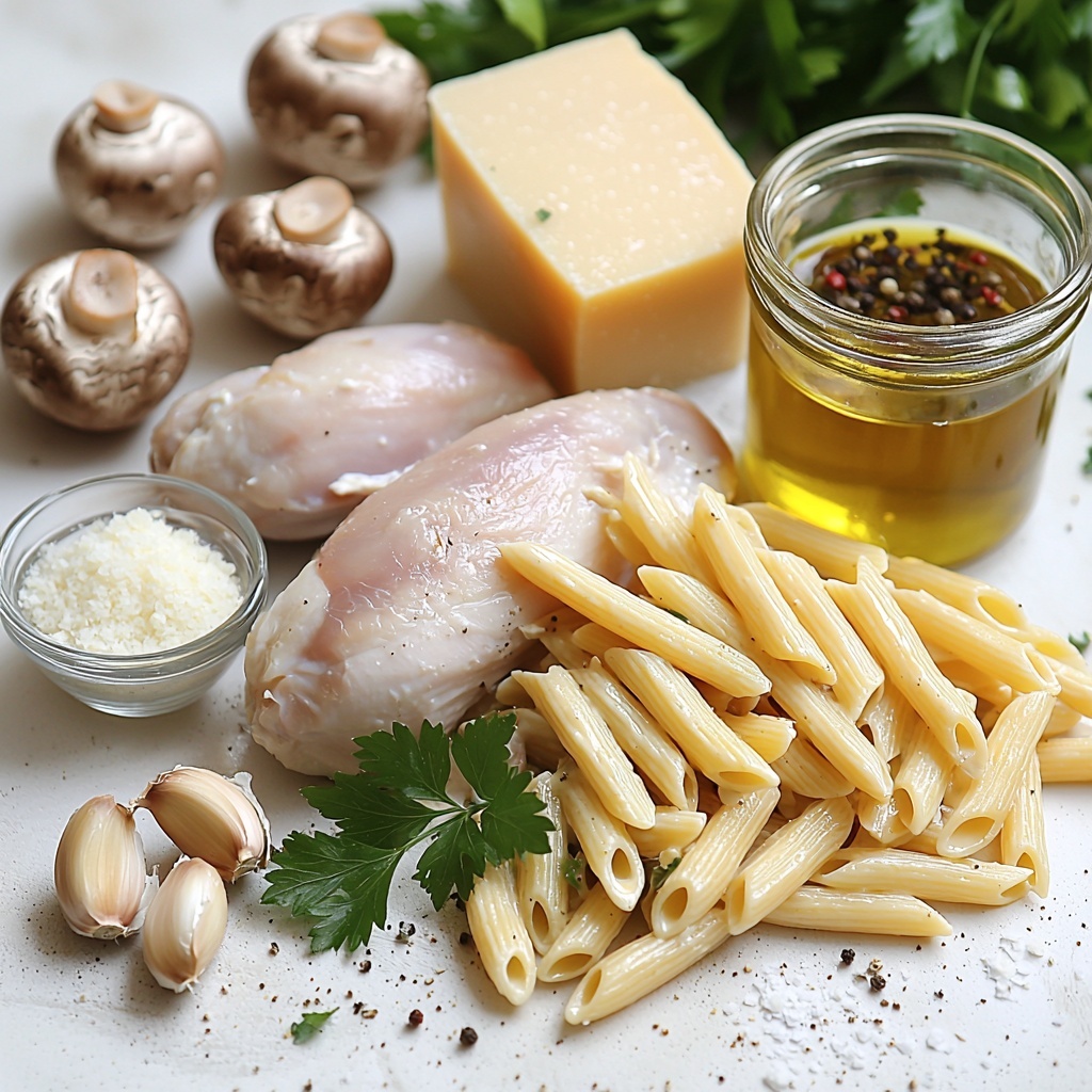 These ingredients are straightforward yet essential for bringing out the delicious depth and creamy smoothness of this dish. Each one plays a special role—from juicy chicken for protein and mushrooms for an earthy touch to Parmesan for that perfect cheesy finish.