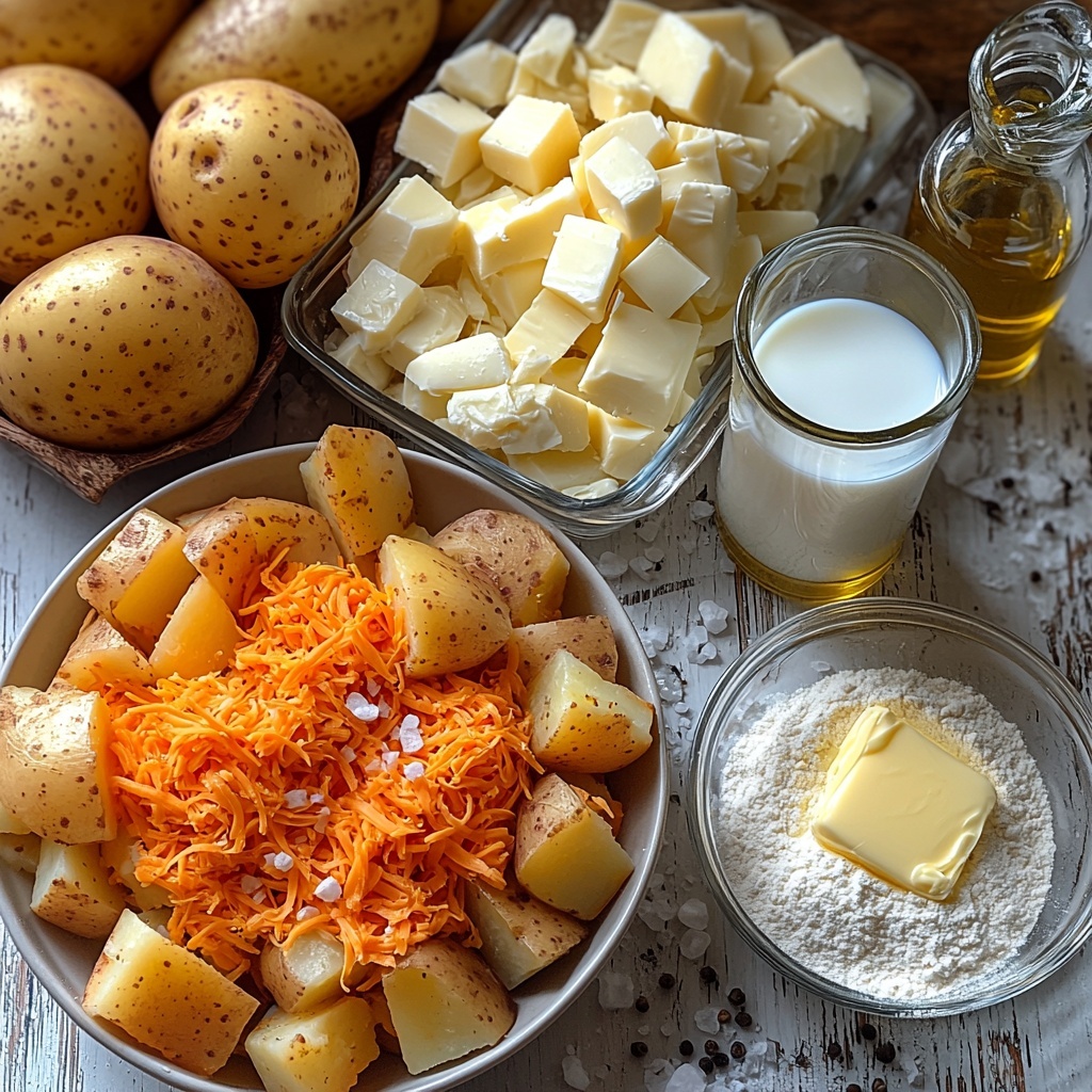 This Crispy Cheesy Stuffed Mashed Potato Nests Recipe calls for simple, straightforward ingredients that work harmoniously to deliver a rich texture and vibrant flavors. Each item is carefully chosen, from the tender russet potatoes that give the perfect base to the cheeses that provide creaminess and a delectable tang. The blend of butter, milk, and seasonings ensures every bite is moist and satisfying, while the flour helps the nests hold their shape and crisp up beautifully in the oven.