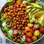 A vibrant and nutritious Crispy Chickpea & Avocado Salad featuring roasted smoky chickpeas paired with fresh greens, juicy cherry tomatoes, creamy avocado, and a zesty lemon-olive oil dressing. This easy-to-make salad is perfect as a light lunch or a healthy side dish packed with protein, fiber, and fresh flavors.