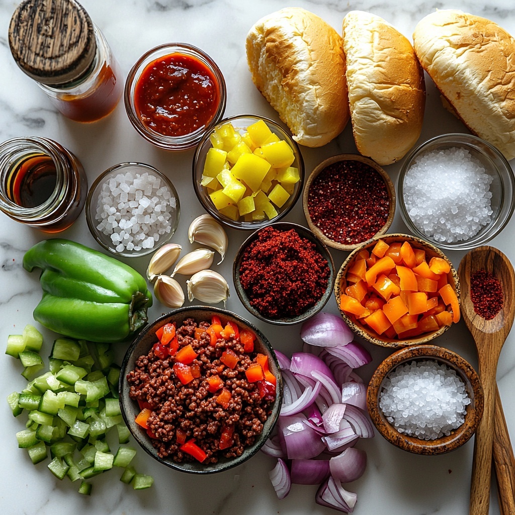 This recipe calls for straightforward, pantry-friendly ingredients that pack a punch in flavor and texture. Each element, from the savory ground beef to the tangy cider vinegar, plays an essential role in creating that iconic sloppy joe taste you’ll love.