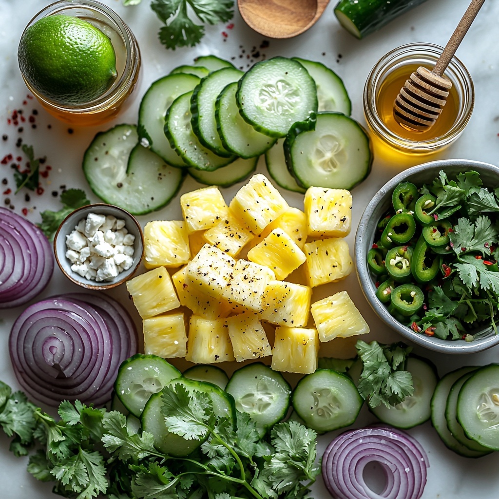 Start by dicing your fresh pineapple into bite-sized pieces to capture its sweet juiciness perfectly. Then slice the English cucumber into half-moons or small cubes — whichever shape you prefer for that satisfying crunch. Thinly slice the red onion and jalapeño, if you’re adding that little spicy twist, and chop the fresh cilantro to sprinkle throughout the salad later. If you’re going for feta, crumble it now so it’s ready to toss in.
