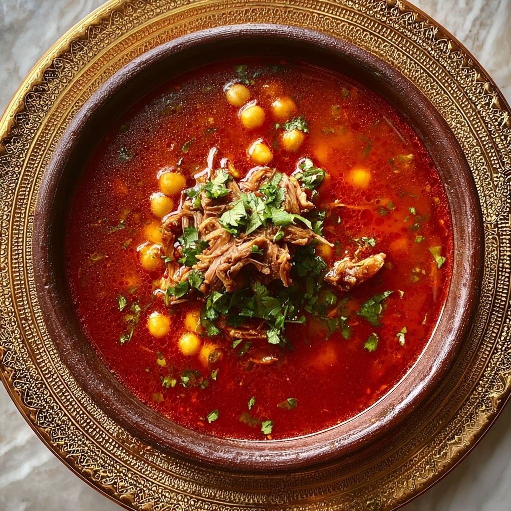 Moroccan Harira is a traditional, hearty soup known for its rich flavors and comforting spices. This recipe combines tender diced beef or lamb with chickpeas, red lentils, and a fragrant blend of herbs and spices simmered in a tomato-based broth. Perfect for a nutritious and warming meal, Harira offers a taste of authentic Moroccan cuisine.