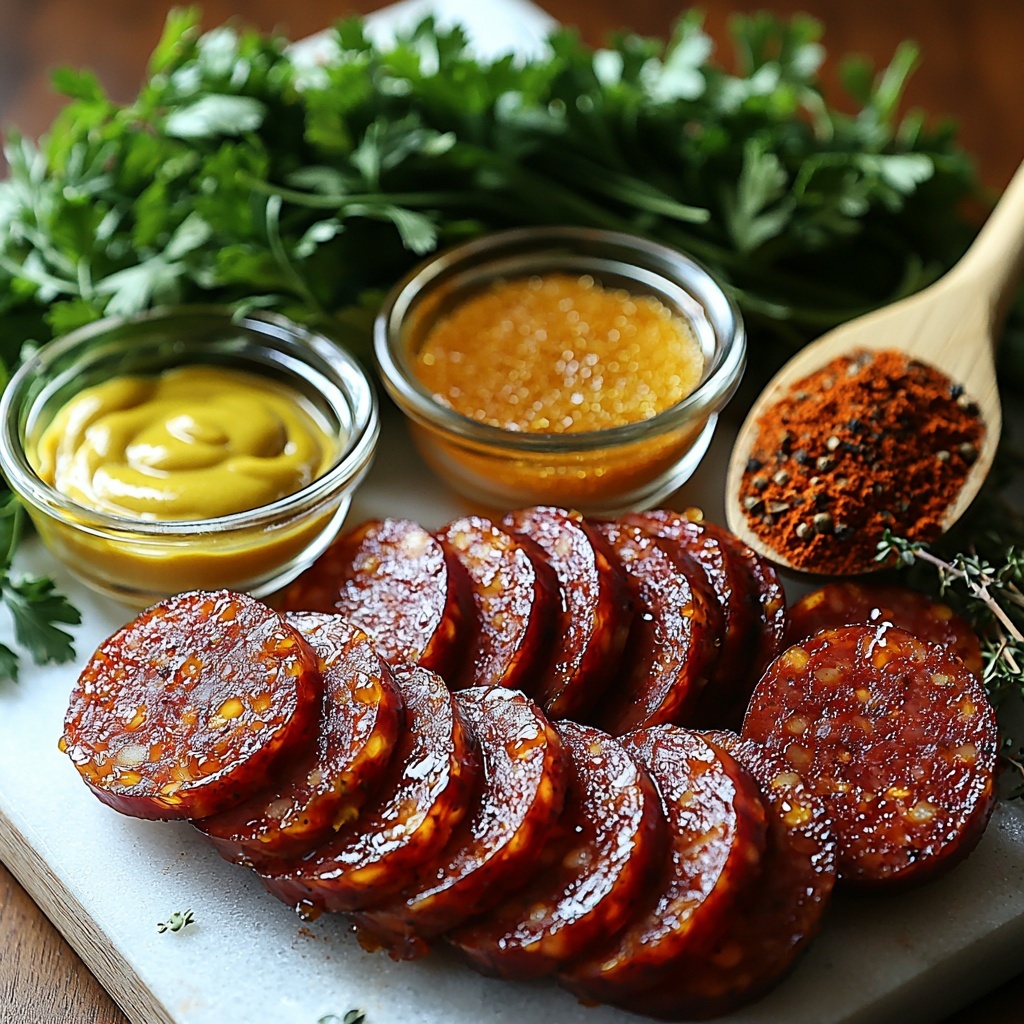 These ingredients are straightforward but essential in crafting the perfect flavor and texture for your Mustard Hasselback Kielbasa Bites : Smoky, Tangy & Game Day Ready Recipe. Each component plays a role in building a complex yet harmoniously balanced taste, from the heartiness of the kielbasa to the sweet and tangy mustard glaze with a smoky kick.