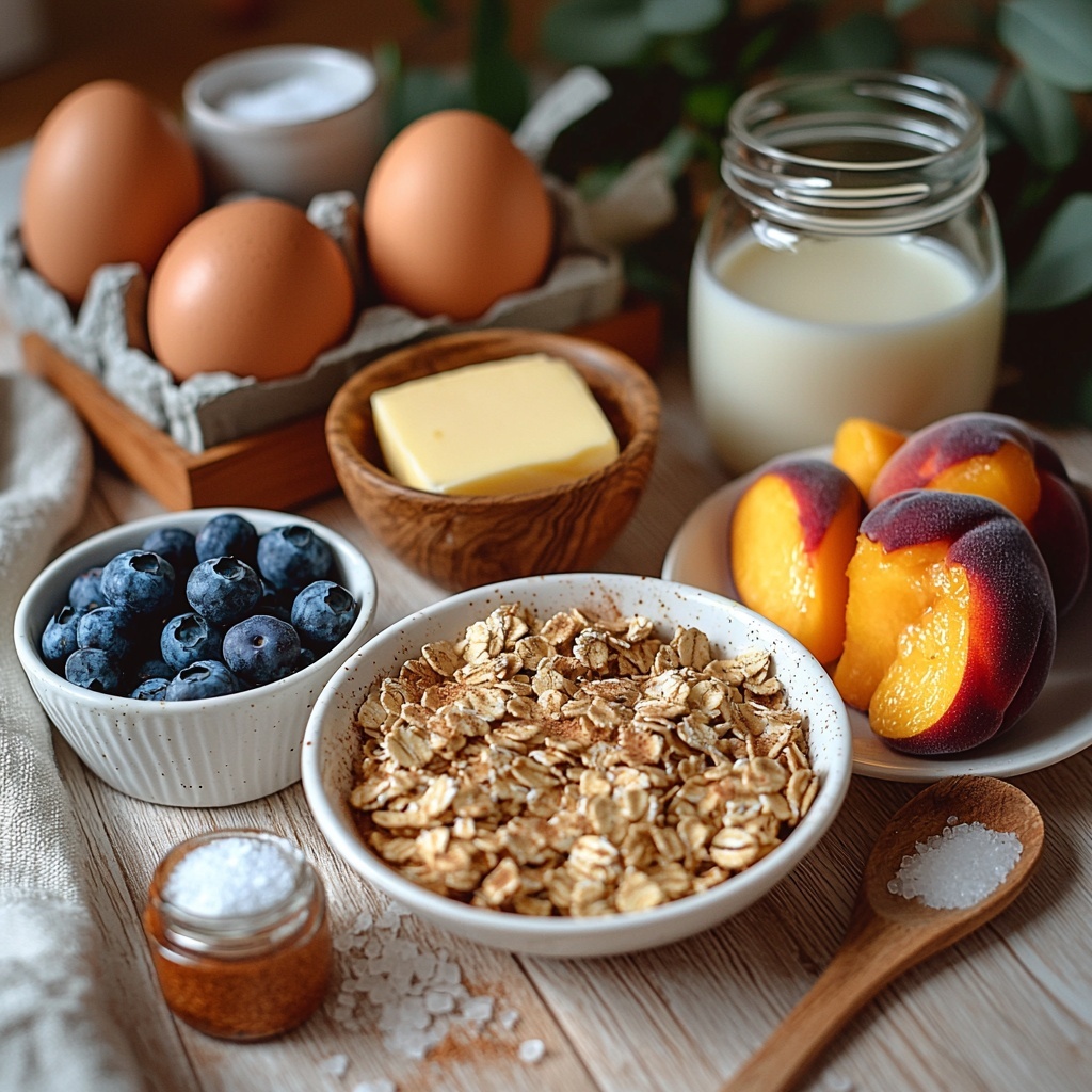 This Peach Berry Baked Oatmeal Recipe relies on simple yet essential ingredients that create the perfect balance of flavor, texture, and color. Each component plays a role in delivering that cozy, satisfying bite you’ll love.