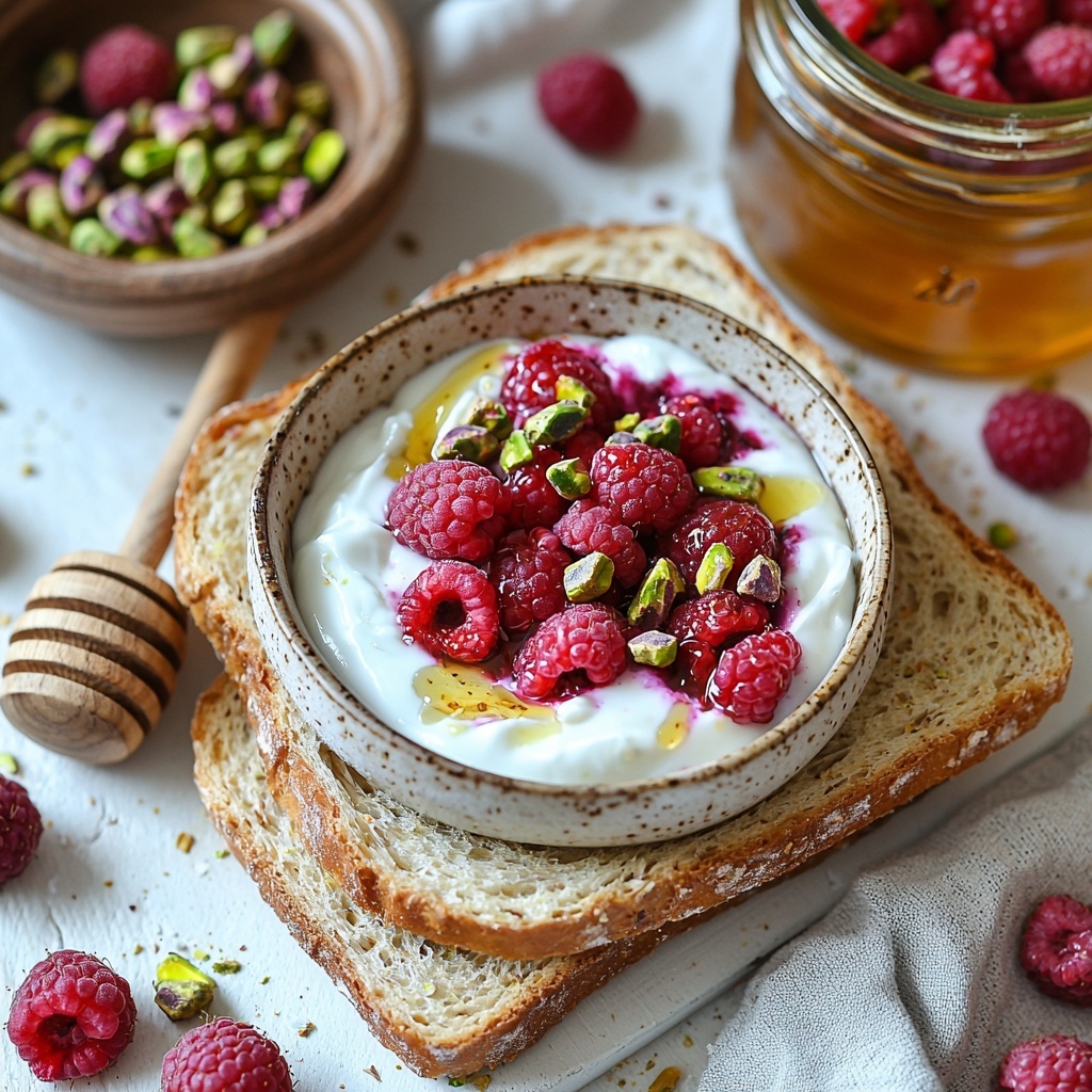 Enjoy your Raspberry Yogurt Toast with Pistachios Recipe right away to experience the freshest textures and flavors. The crisp toast, creamy yogurt, juicy raspberries, and nutty crunch make each bite irresistible.