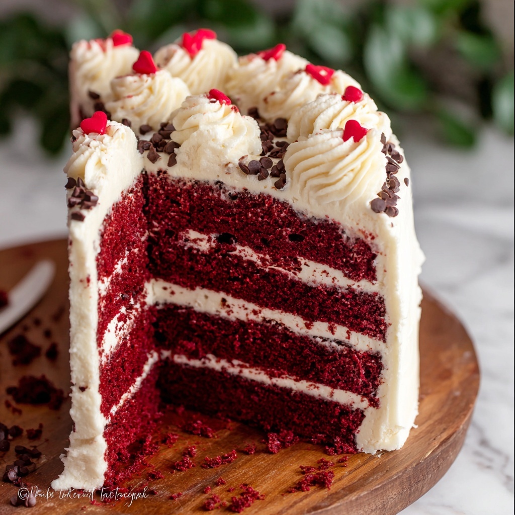 If you’re feeling adventurous, slice your Red Velvet Chocolate Chip Cake Recipe into petite mini cakes or cupcakes for easier sharing at parties. Wrapping individual portions in parchment with a bow can transform them into thoughtful gifts. Another fun idea is layering the cake in a trifle dish with extra chocolate chips and whipped cream for a no-fuss dessert showstopper.