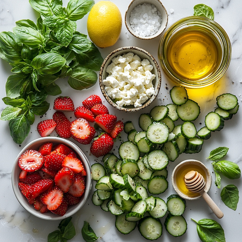 - Preparation: Chop the strawberries and cucumbers into bite-sized pieces. Finely chop the fresh basil and mint leaves. Crumble the feta cheese and set all ingredients aside for easy assembly.
