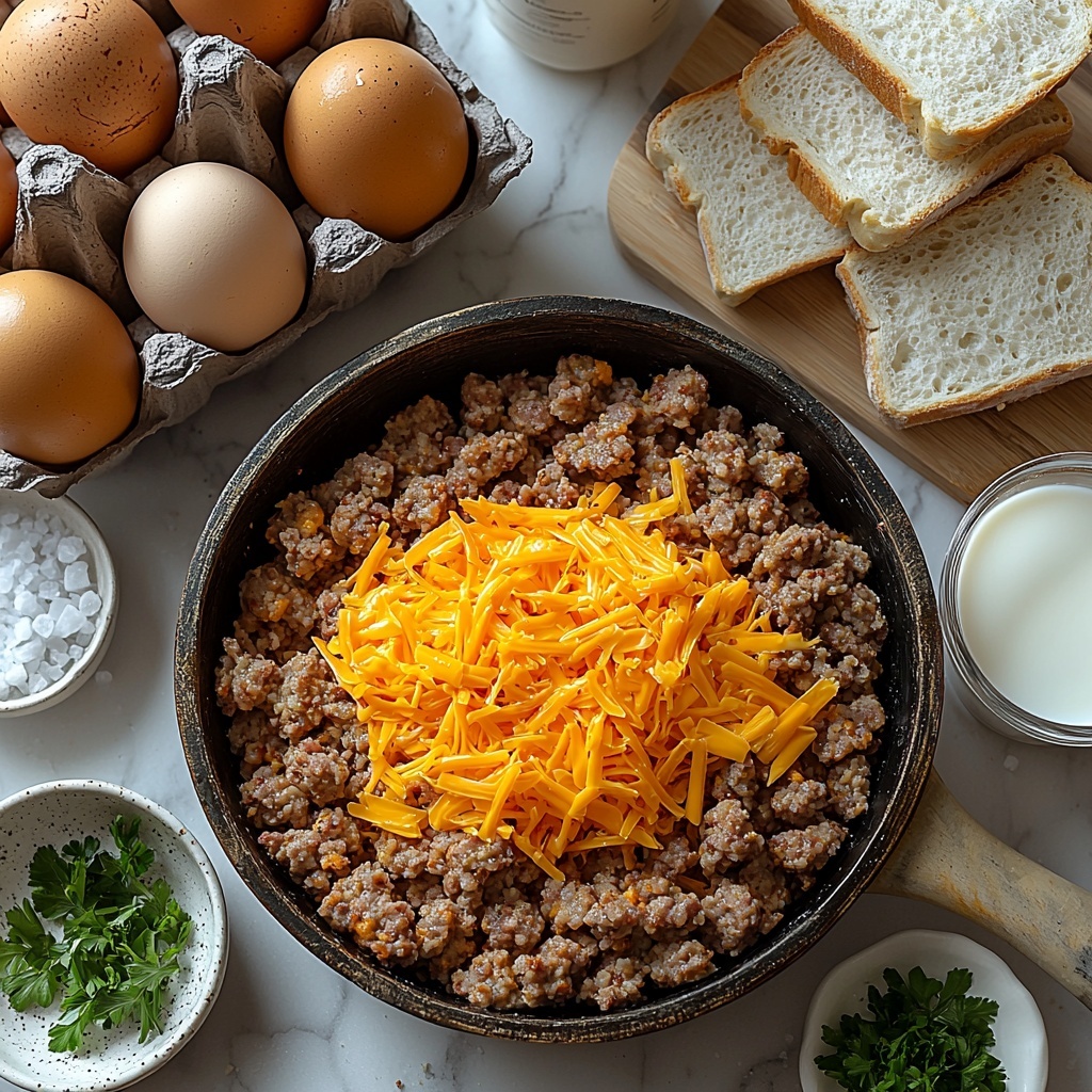 Evenly scatter the browned sausage over the bread cubes. Then, generously sprinkle the shredded cheddar cheese over the sausage layer. The cheese not only brings flavor but also helps bind the casserole together while baking, creating blissfully gooey pockets of melted happiness.