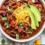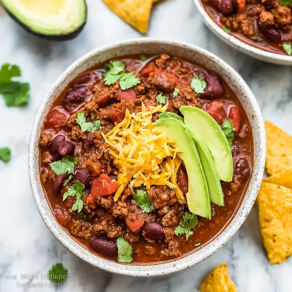 - Serve and Garnish: Serve the chili hot, garnished with optional toppings such as chopped avocado, guacamole, scallions, cilantro, or tortilla strips for added texture and flavor.