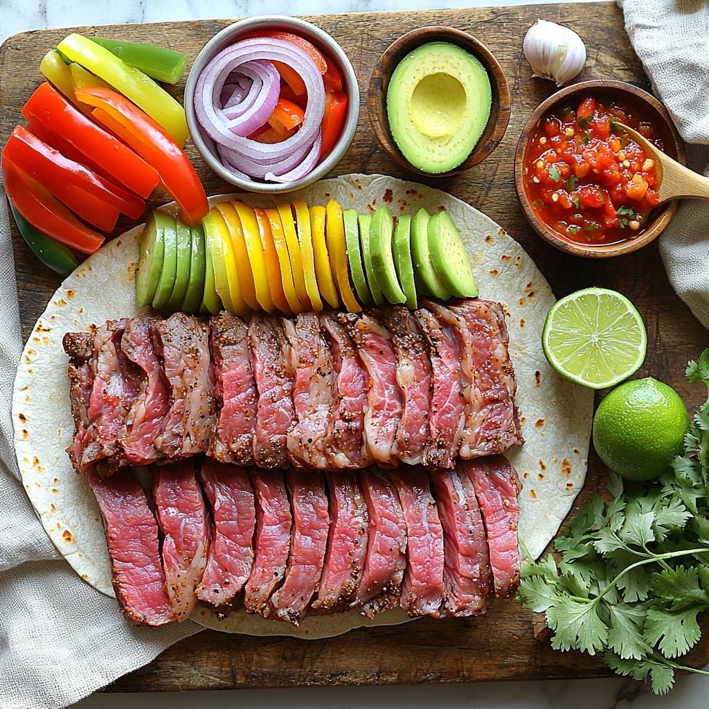 7. Slice and Assemble: Slice the rested steak thinly against the grain, then toss the steak slices with the roasted bell peppers and onions. Serve immediately with warm tortillas, salsa, avocado or guacamole, lime wedges, and fresh cilantro for garnish.