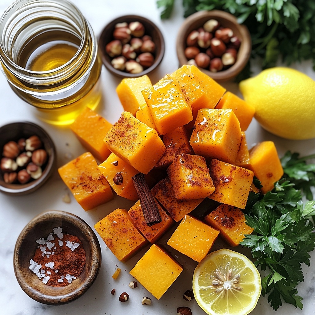 These ingredients are simple yet carefully chosen to create layers of flavor and texture. Each element plays a crucial role, from the natural sweetness and creaminess of the squash to the spicy warmth and bright acidity, rounded out by toasty nuts for crunch.