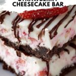 Delicious Strawberry Cheesecake Bars featuring a fudgy brownie crust layered with a creamy strawberry-studded cheesecake filling, topped with melted chocolate and fresh strawberry halves. Perfect as a sweet treat for gatherings or a decadent dessert at home.