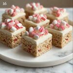 Delightful Peppermint Bark Rice Krispie Treats combine the classic marshmallow and crispy cereal base with a festive twist of peppermint extract, white chocolate drizzle, and crunchy crushed peppermint candies, perfect for holiday snacking or gifting.